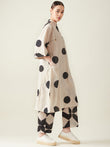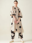 Crafted from lightweight Cotton Cambric fabric the classic combination of Off-White and Black adds a touch of calmness to the ensemble. The set features a relaxed, loose-fit kurta paired with coordinating bottoms and adorned with whimsical polka dots created through hand-clamp dyeing, adding a hint of playfulness to the outfit. Whether you're attending a casual outing or a daytime event, the "Polka Kurta Set" is designed to make you stand out.