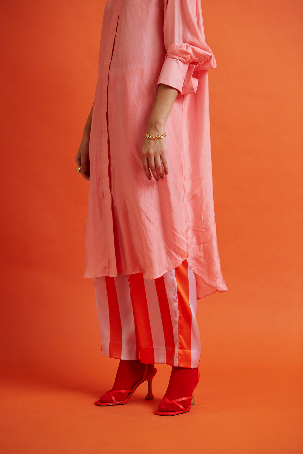 Let the bold Flamingo Pink and Orange hues transport you to a tropical paradise. It's a burst of color that's impossible to ignore. Dive into the world of digital prints with this set. Crafted from Modal Silk, this set feels as luxurious as it looks. The "Betty Shirt Set" is your go-to for versatile style.