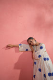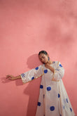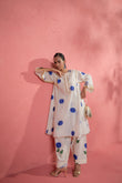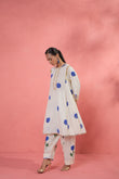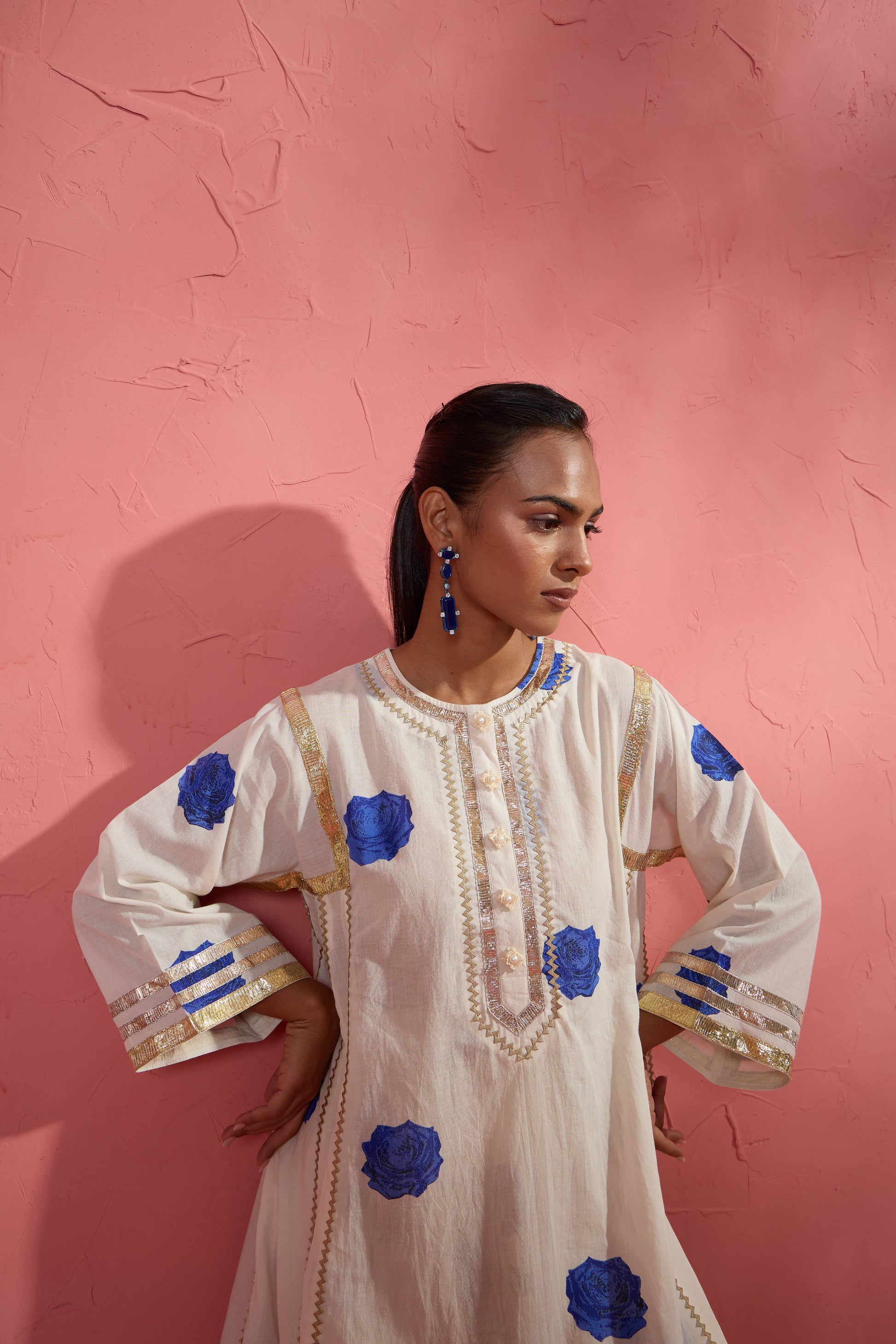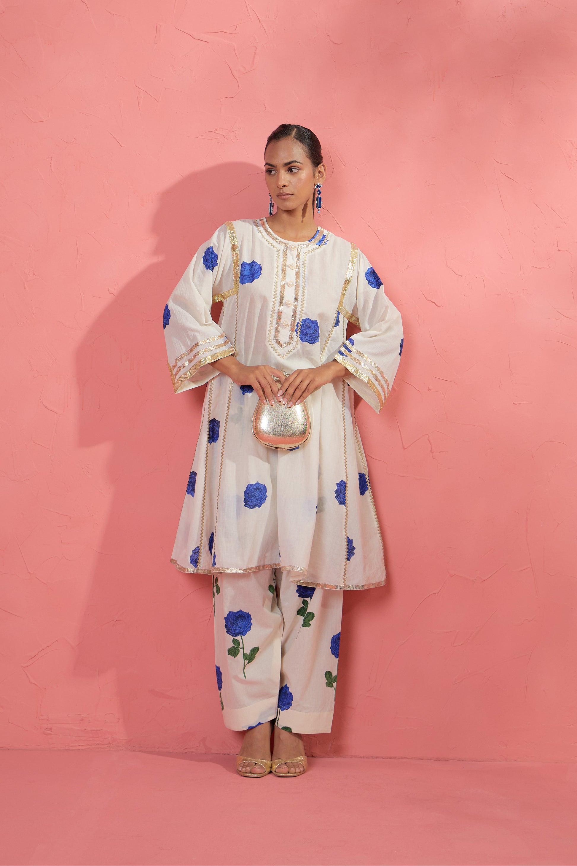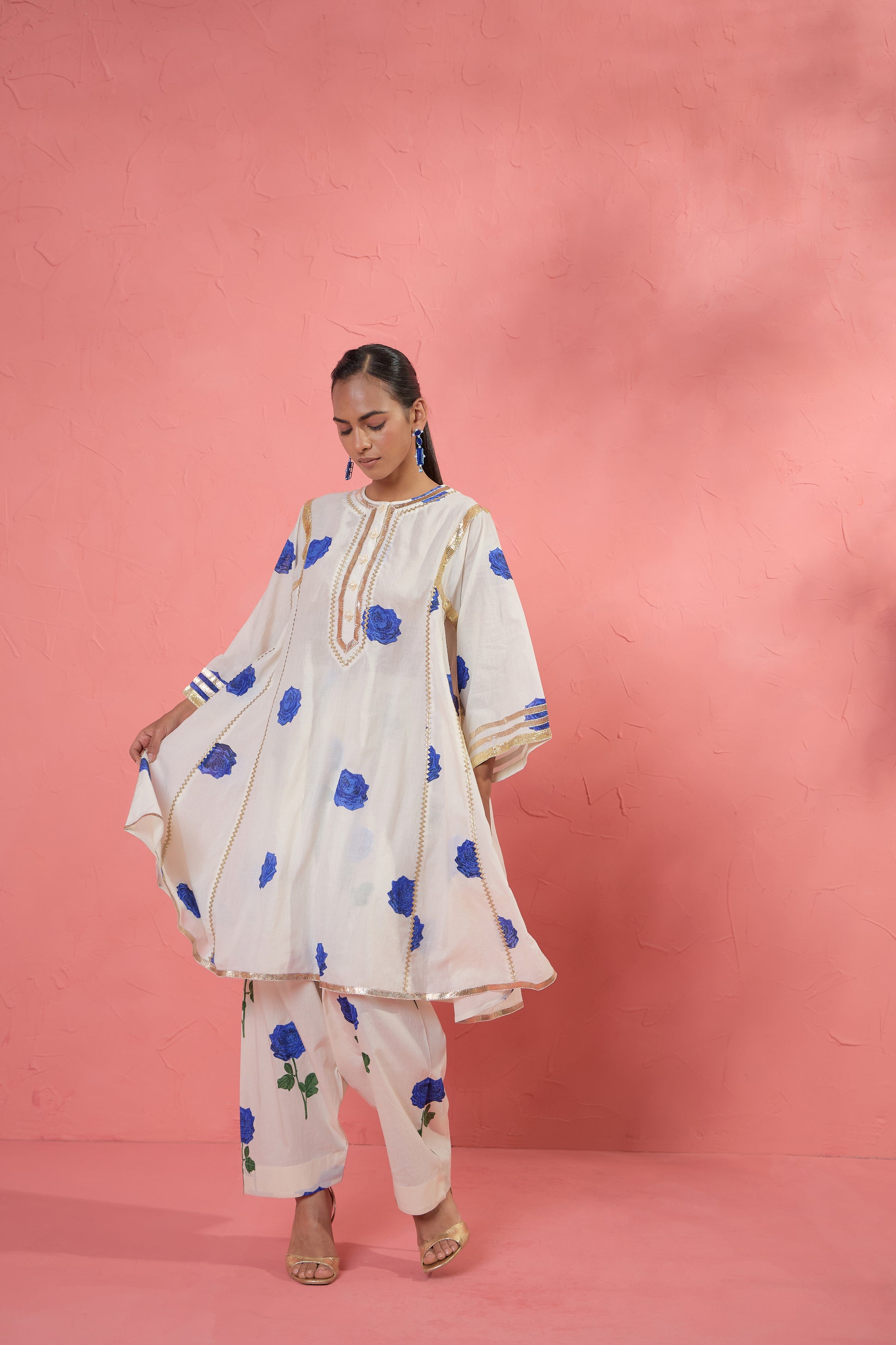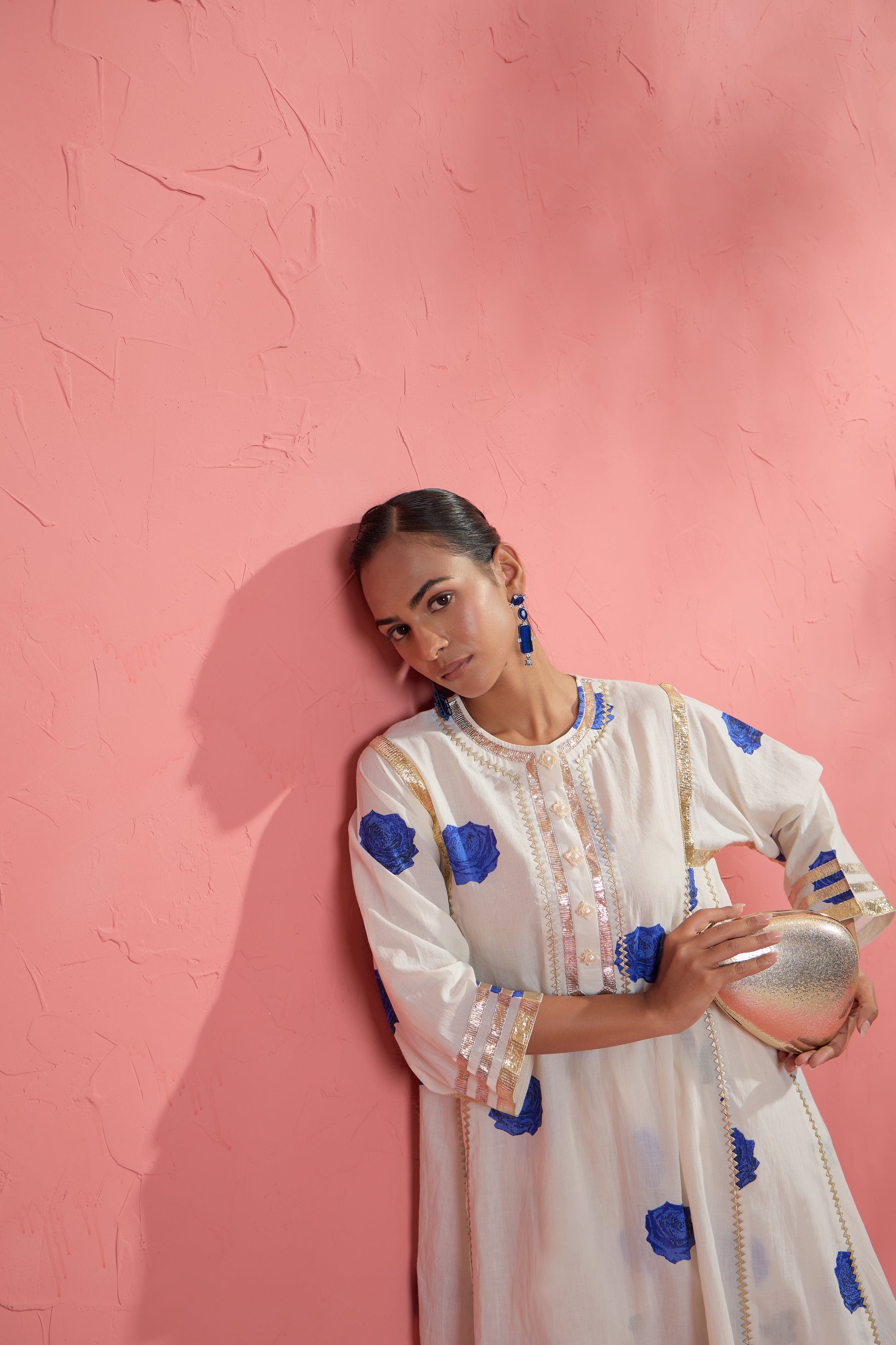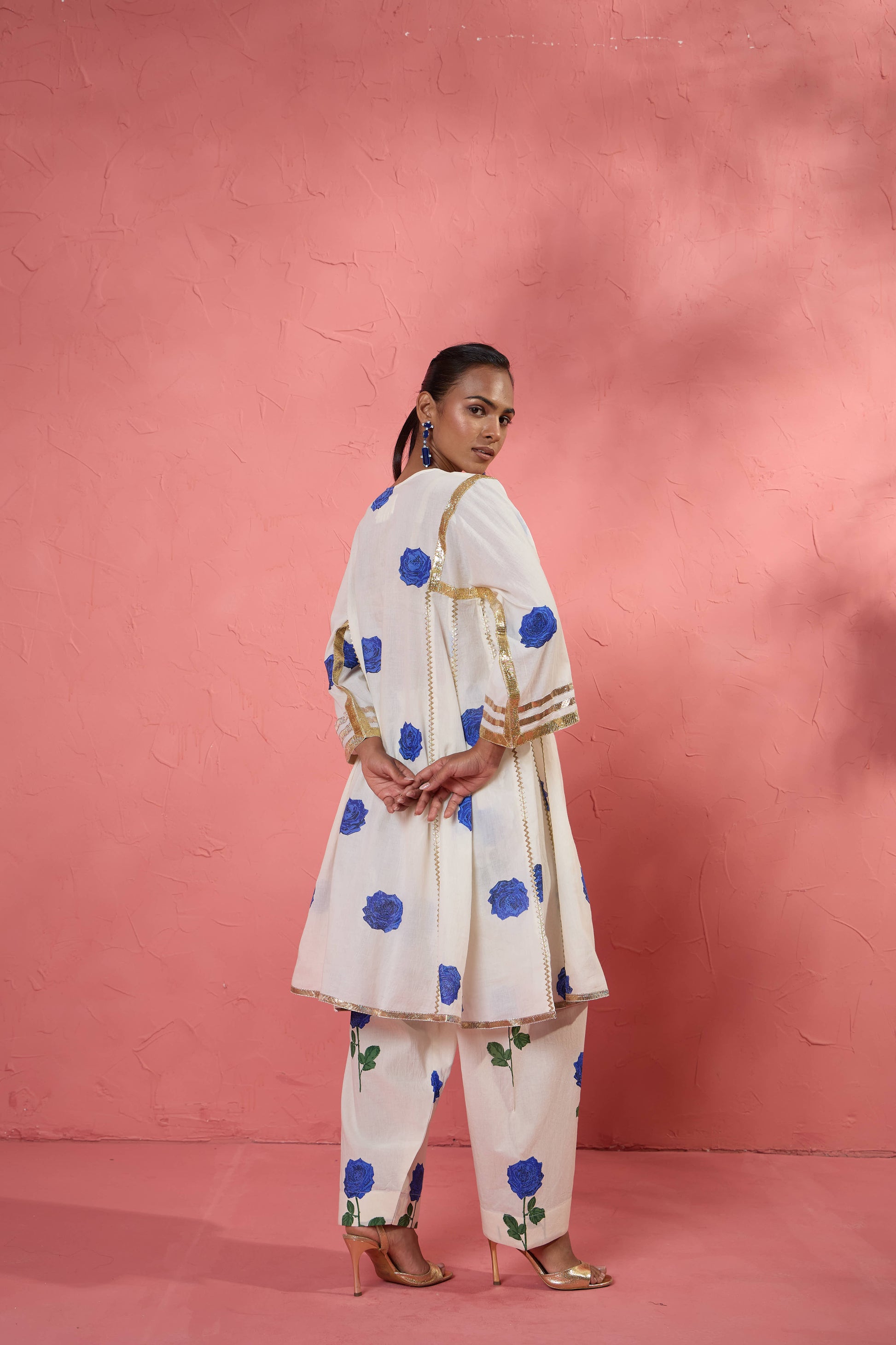 Description:- An elegant ivory kurta set featuring striking blue floral motifs and intricate gold detailing along the neckline and sleeves. Designed in a flared silhouette with statement sleeves, it is paired with printed pants for a refined, graceful, and effortlessly festive look.