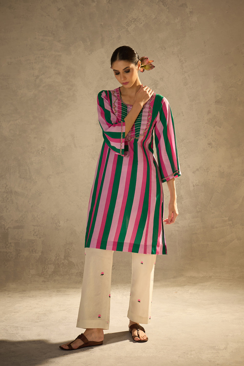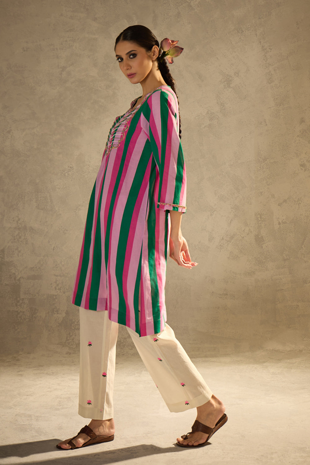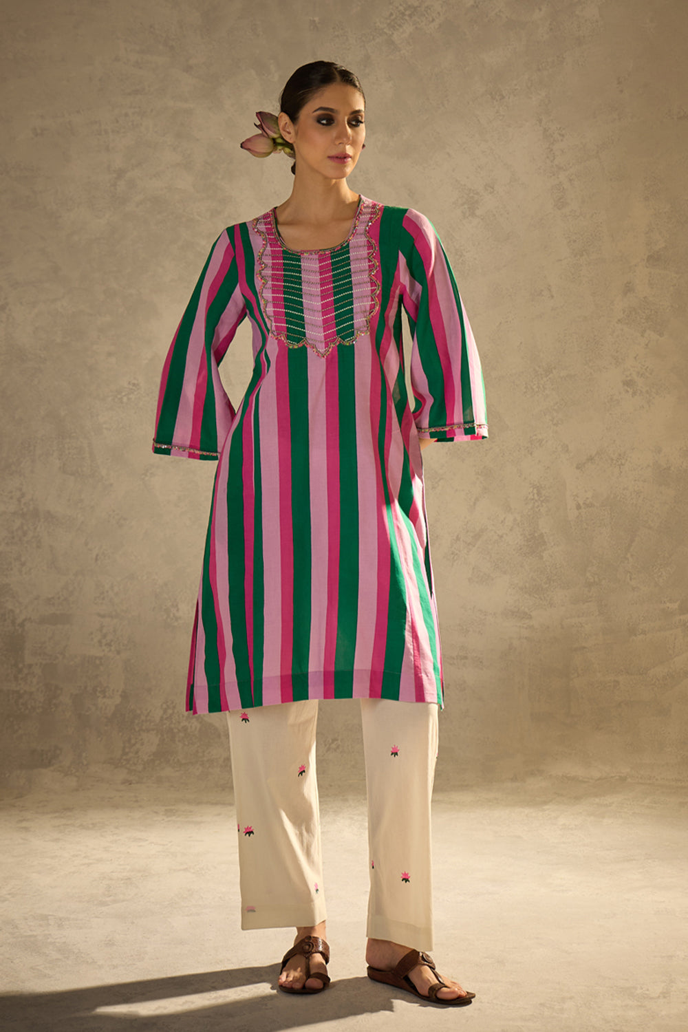 Description:- Crafted in soft, breathable cotton-cambric, this kurta set features playful stripes and rich embellishment. The kurta boasts intricate sequin and bead work on the yoke and sleeves. The pants are straight-cut with delicate lotus block prints.