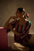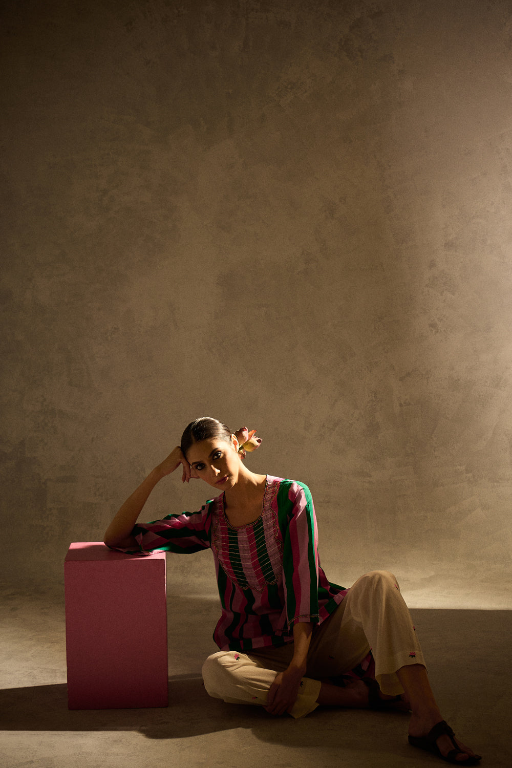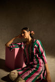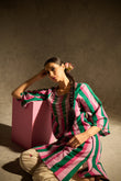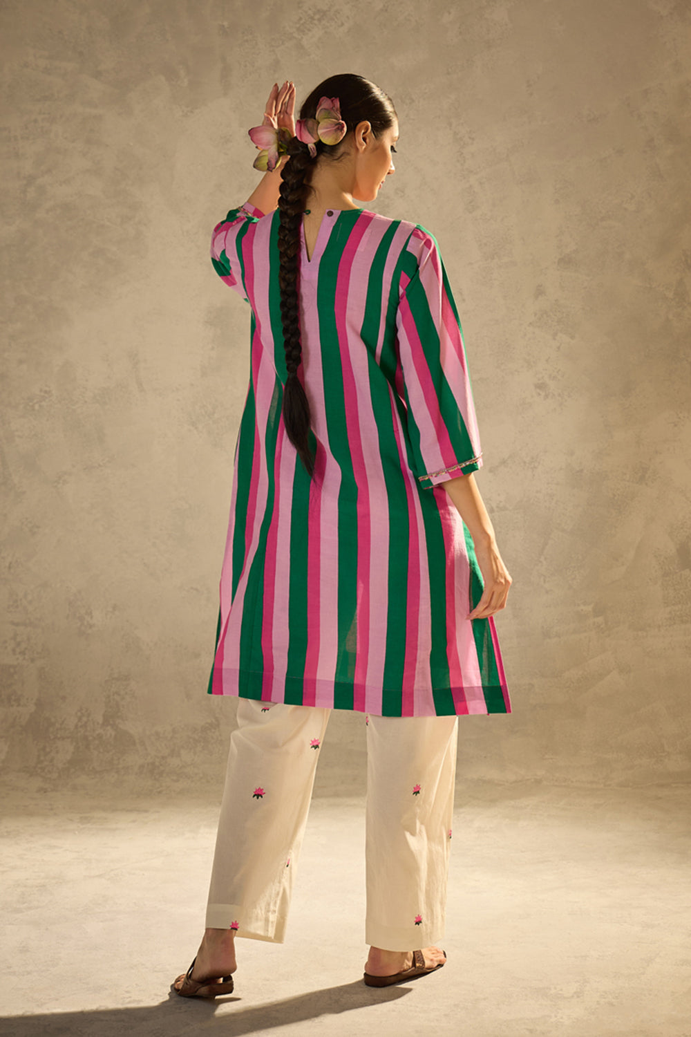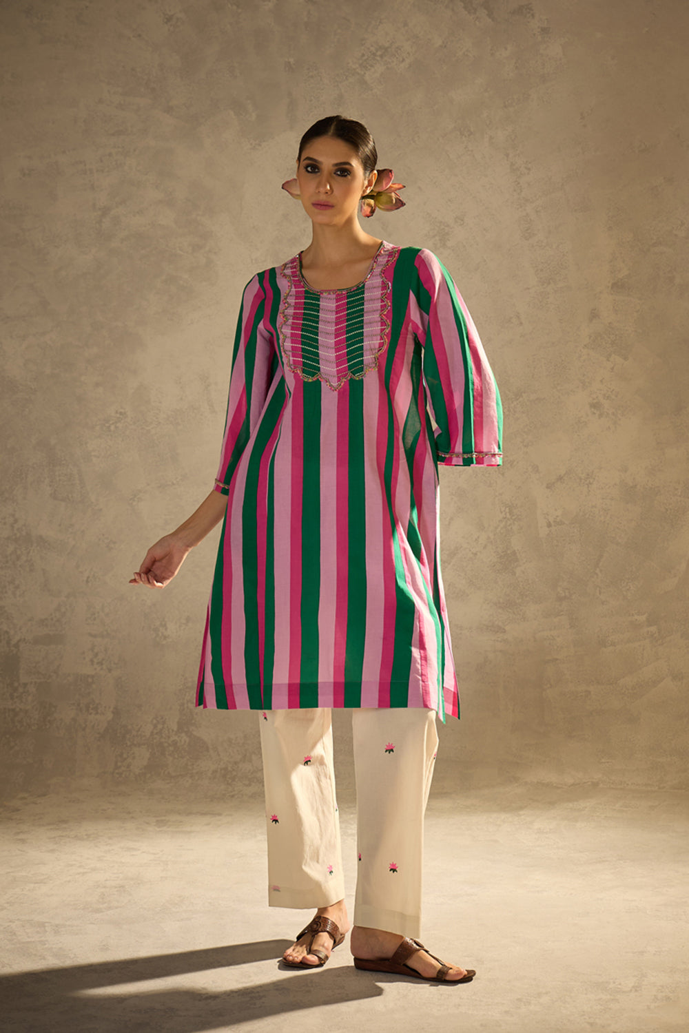Description:- Crafted in soft, breathable cotton-cambric, this kurta set features playful stripes and rich embellishment. The kurta boasts intricate sequin and bead work on the yoke and sleeves. The pants are straight-cut with delicate lotus block prints.