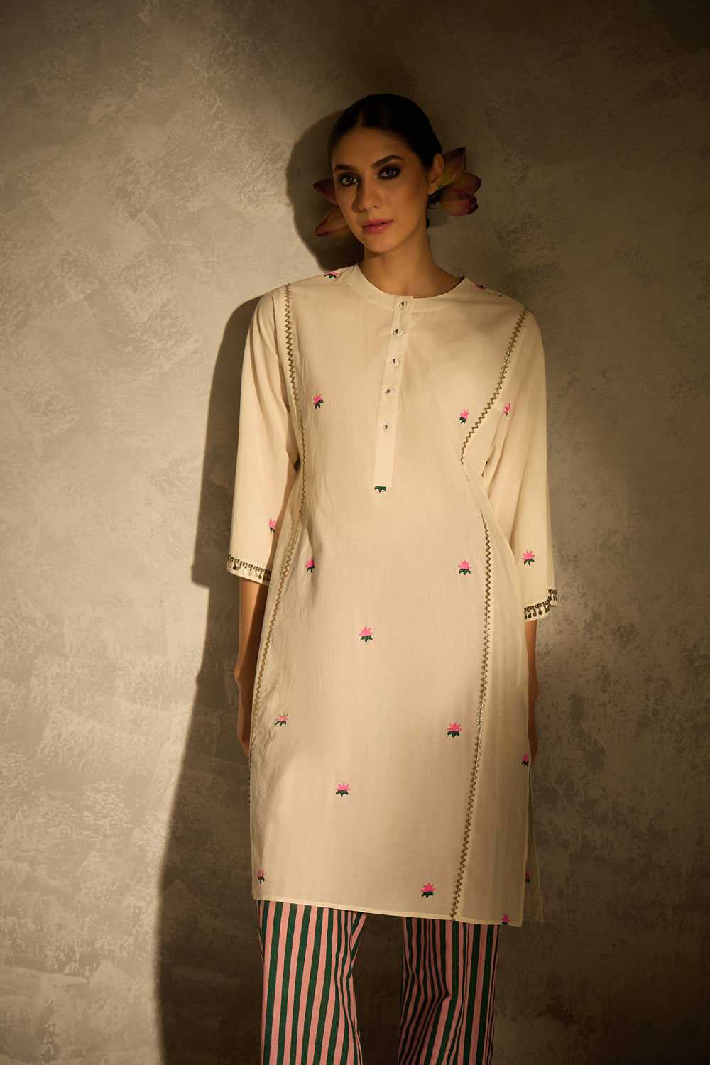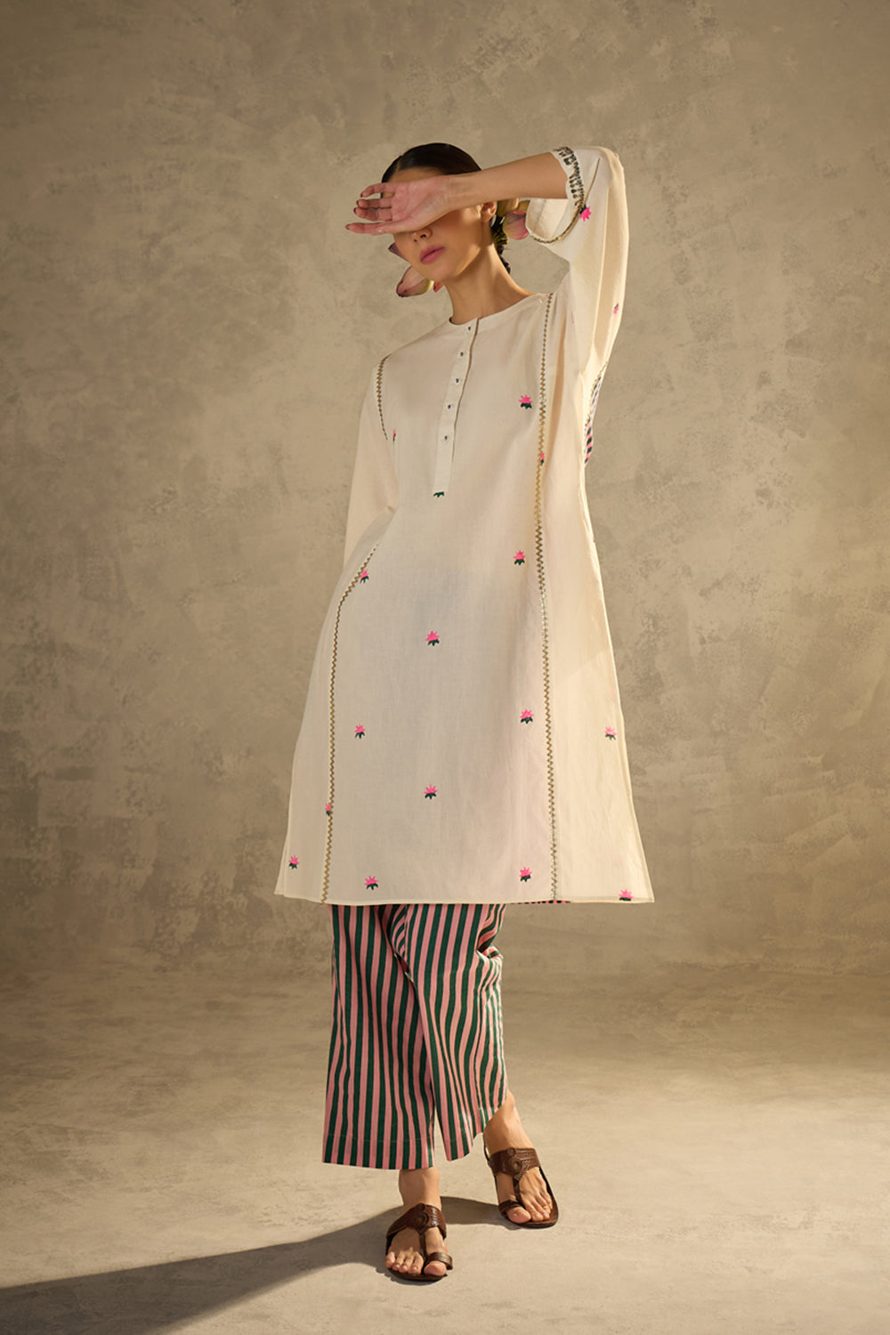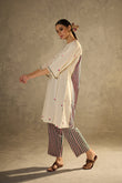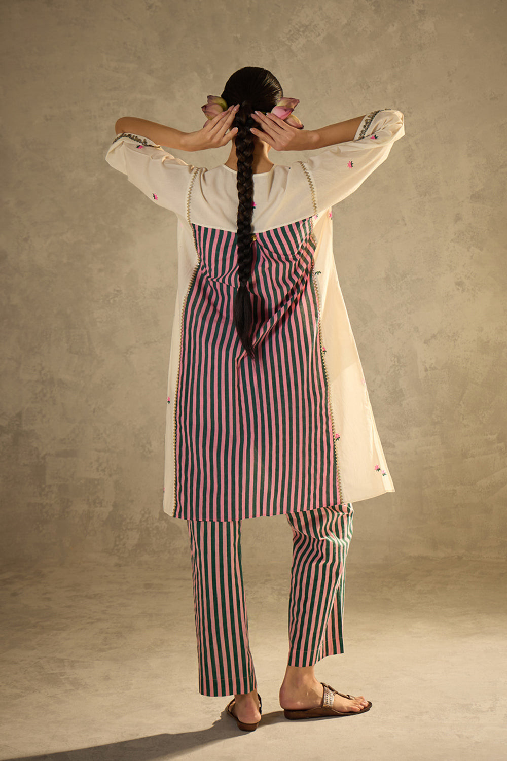 Description:- This kurta set features a delicate lotus block print with stripe detailing at the back and fine handwork on the sleeves. Paired with stripe block printed pants