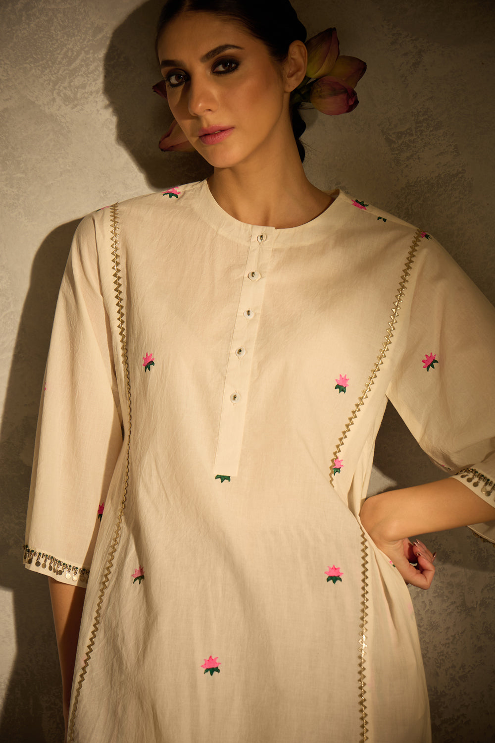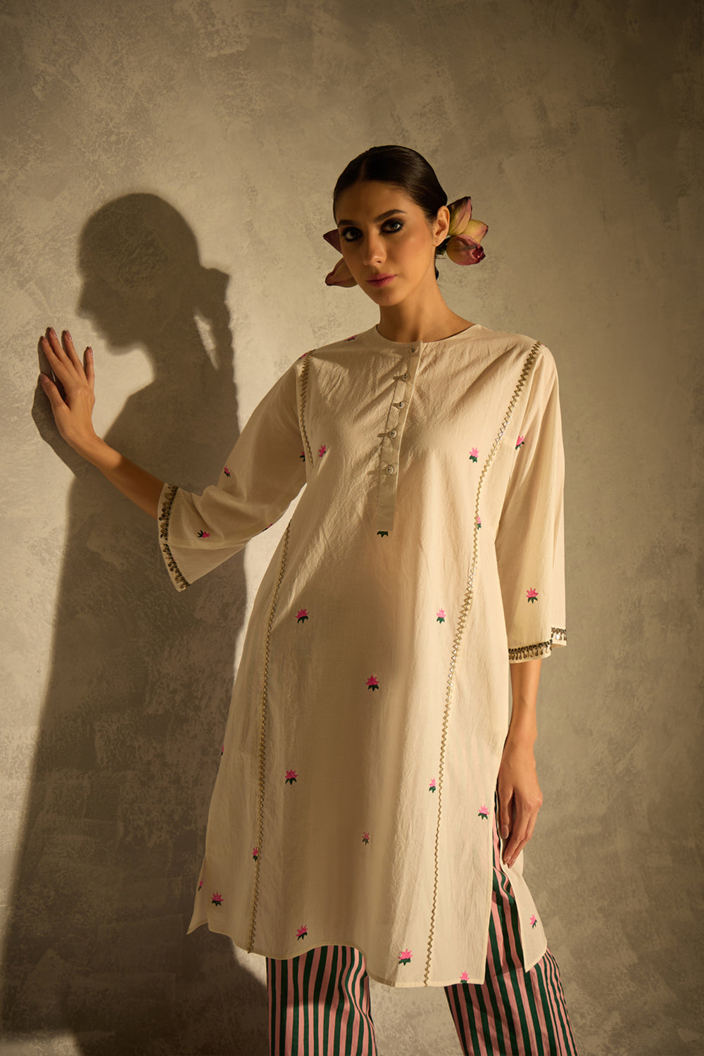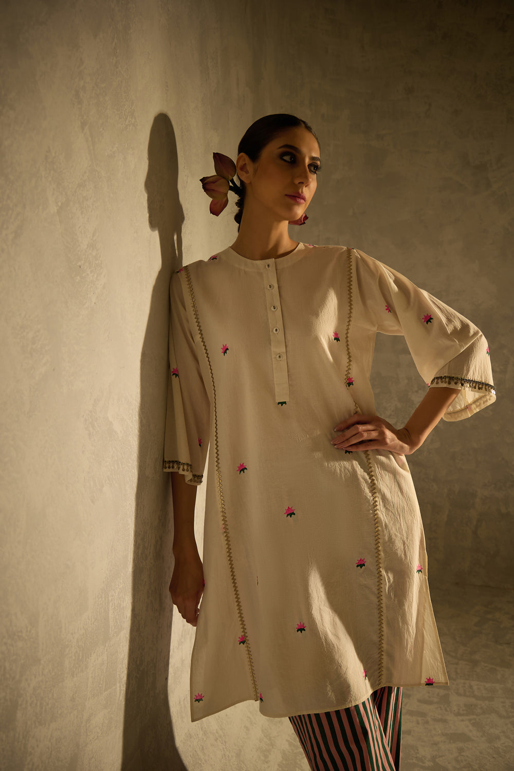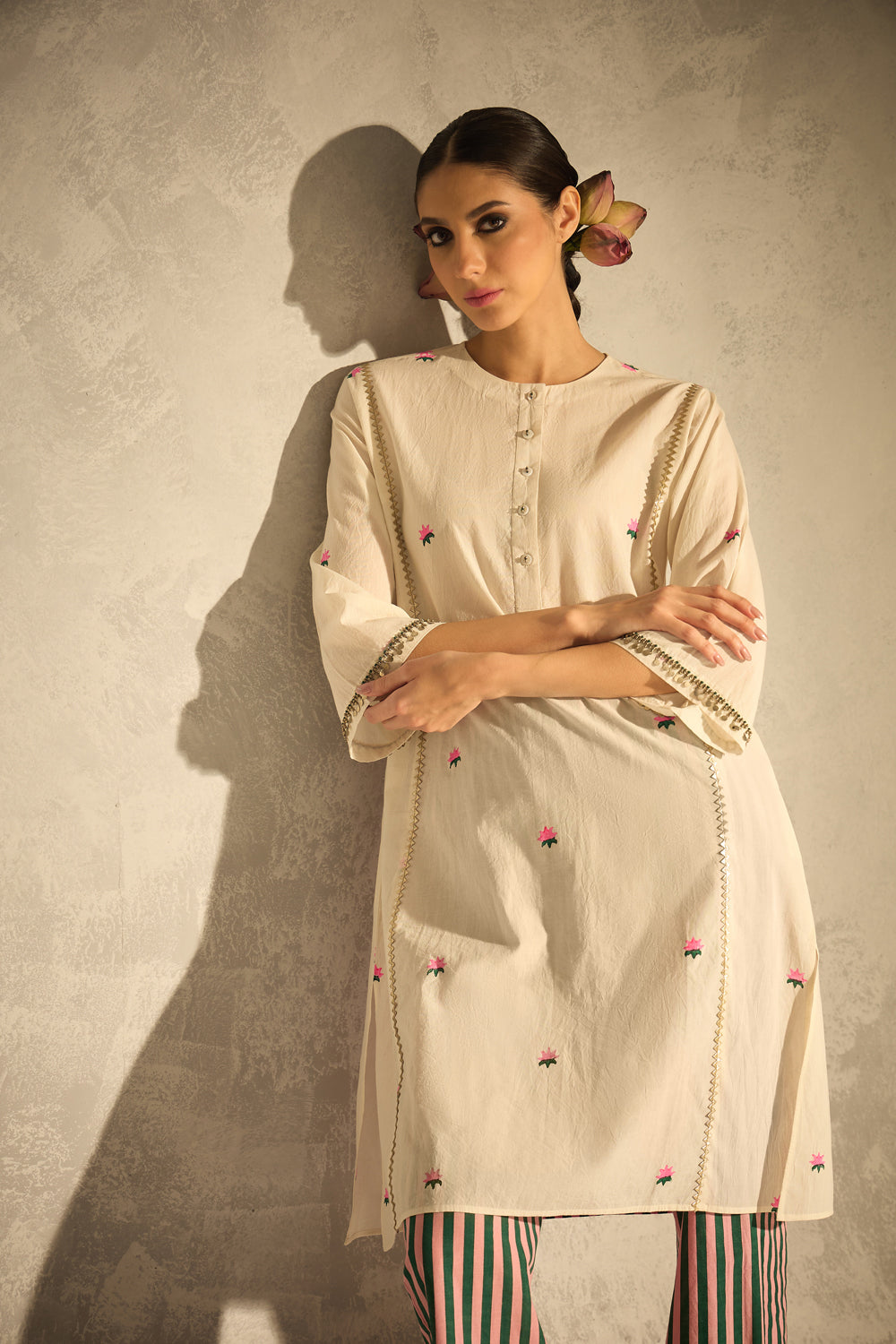 Description:- This kurta set features a delicate lotus block print with stripe detailing at the back and fine handwork on the sleeves. Paired with stripe block printed pants